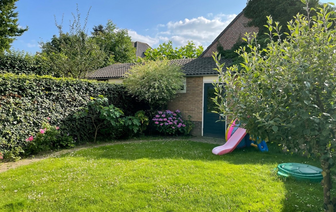 De tuin is gesitueerd op het zuidwesten, heeft een achterom en beschikt over een stenen berging.